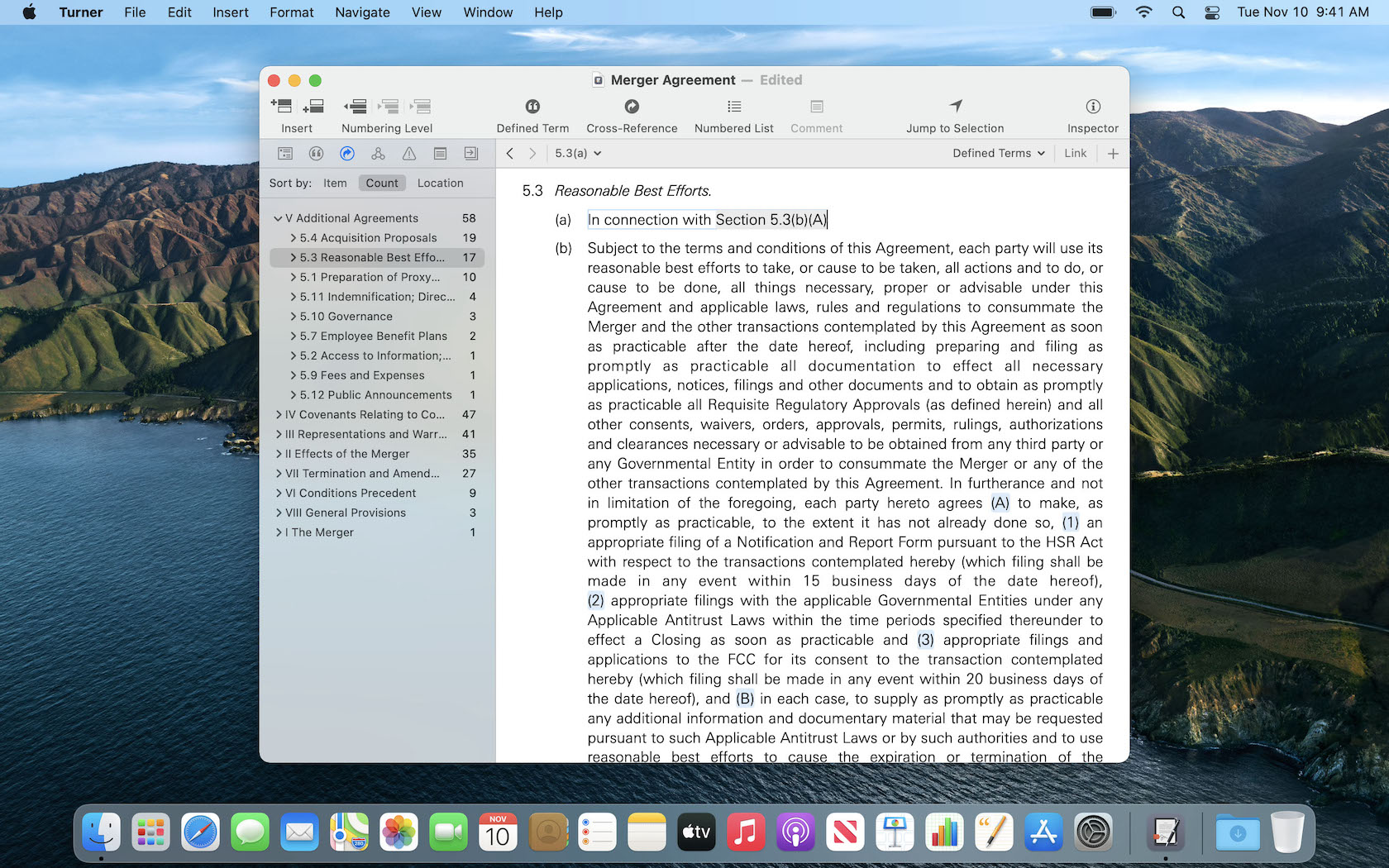 Getting the gist of a contract is a challenge. With Turner, you can use the Navigator to see the big picture at a glance. View an outline of your contract, a list of defined terms, and much more. Filter items in the Navigator to find exactly what you’re looking for. As you work, Turner updates the Navigator automatically, so you always have the latest information.